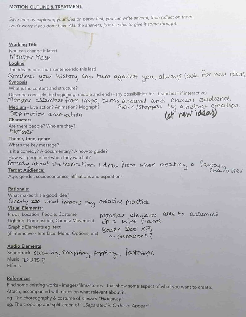Our next brief is to produce a 1 minute animation expressing some component of our creative inspiration or history. Yet again the amount of possibillities made the initial stages quite overwhelming. The project tutor encouraged us to make a start by fleshing out some Motion Treatments, giving fledling ideas a bit more weight.
