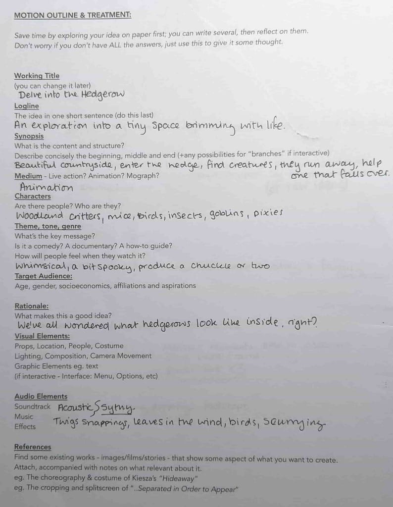 Our next brief is to produce a 1 minute animation expressing some component of our creative inspiration or history. Yet again the amount of possibillities made the initial stages quite overwhelming. The project tutor encouraged us to make a start by fleshing out some Motion Treatments, giving fledling ideas a bit more weight.