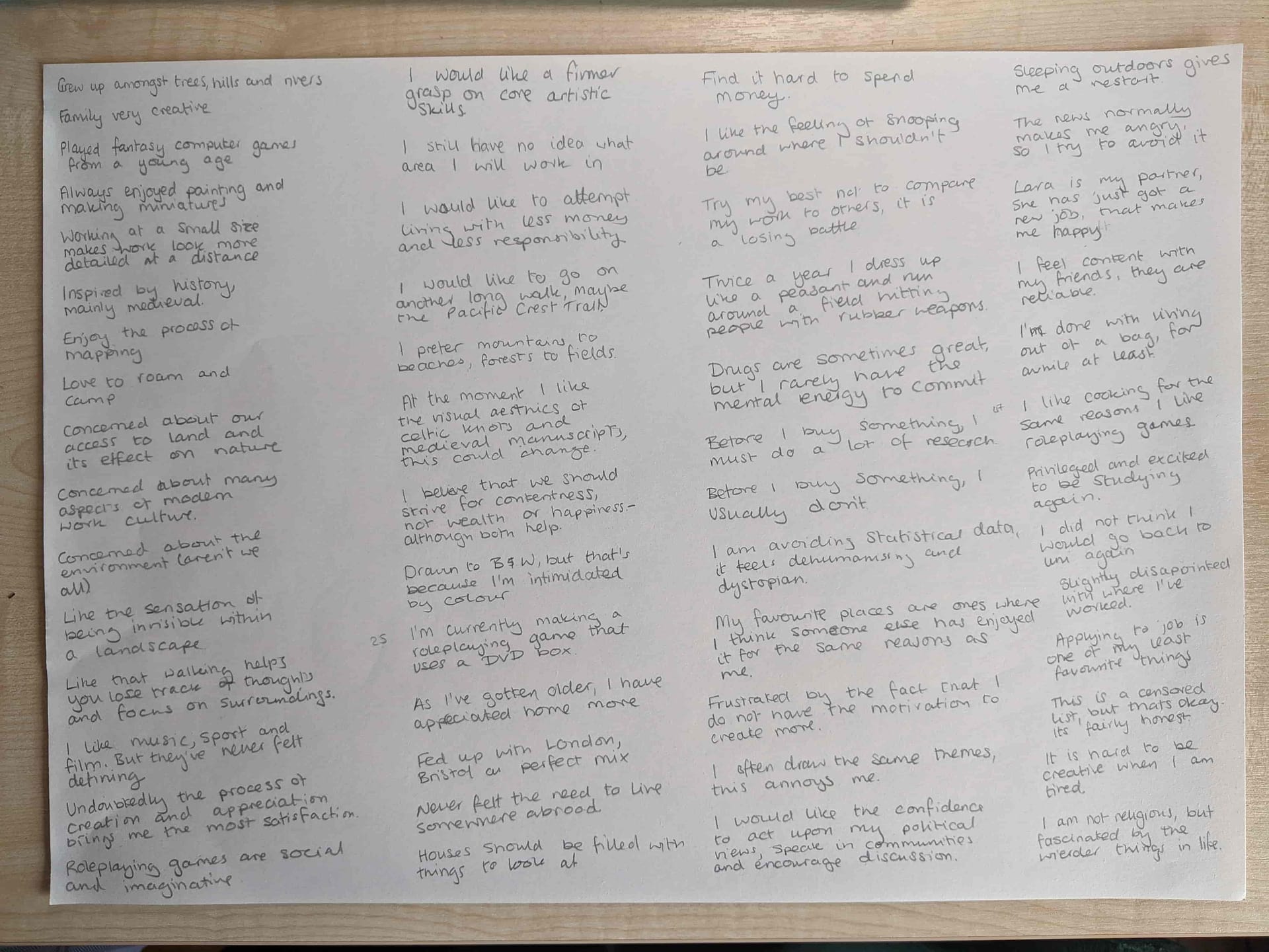One of my biggest challenges has been tackling the somewhat unusual ‘things’ that initially set for myself. They range from everything to anxieties about creative work and my ambitions as a Right to Roam activist. This creates an exciting variety of information to work with, but also a large amount of potential categories, looks and outcomes.