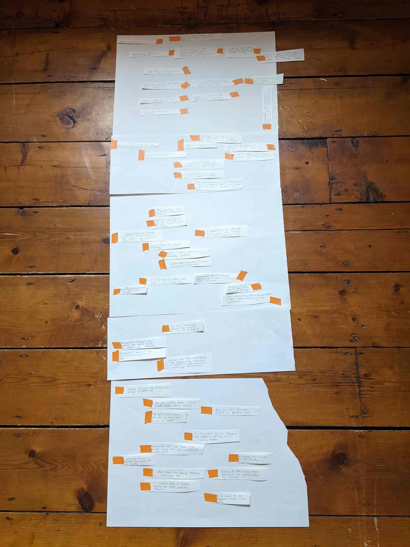 Below you can see my process of snipping up each ‘thing’ and rearranging them into categories. Unfortunately the whole process began taking up a lot of space that I didn’t have to I shifted them to the digital workspace Miro. This allowed me to shift things about and use colour easily.