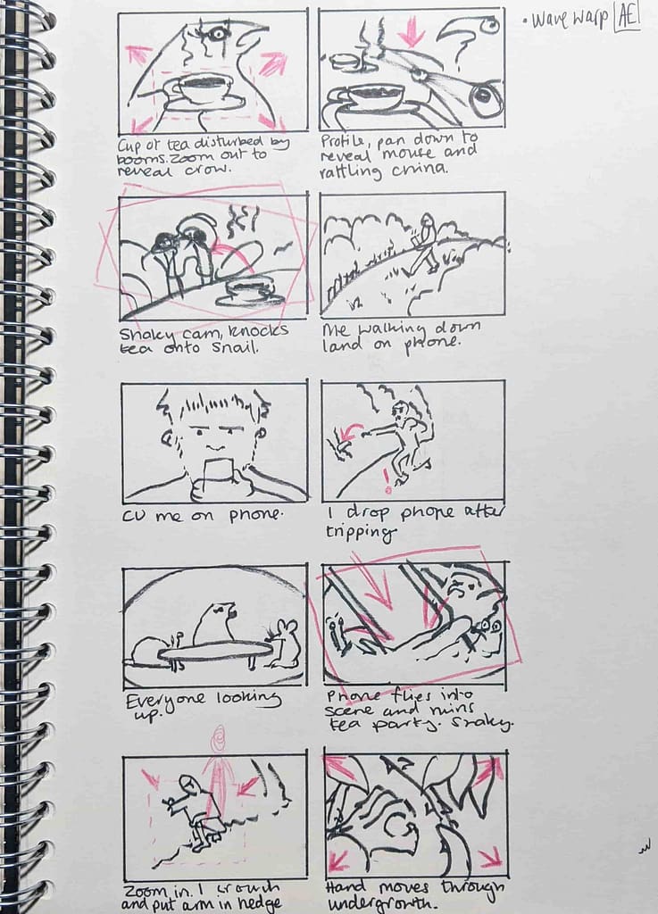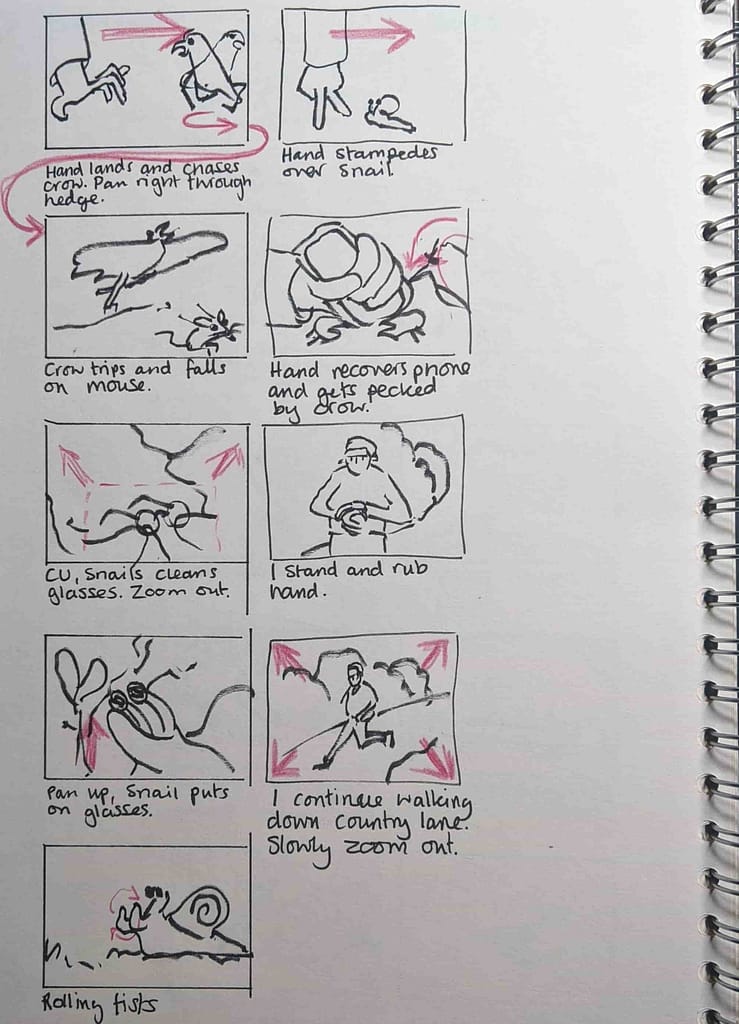 My first storyboards of this idea involved a core set of hedge based characters that would be interrupted by my presence, in the form of me dropping an object into the hedge. I aimed to highlight the creative potential of the hedge by putting it in a different style to just me walking alongside one. I also hoped that the juxtaposition of me just trying to recover this object and my hand going on a fantastical adventure within the hedge could create some funny moments.
