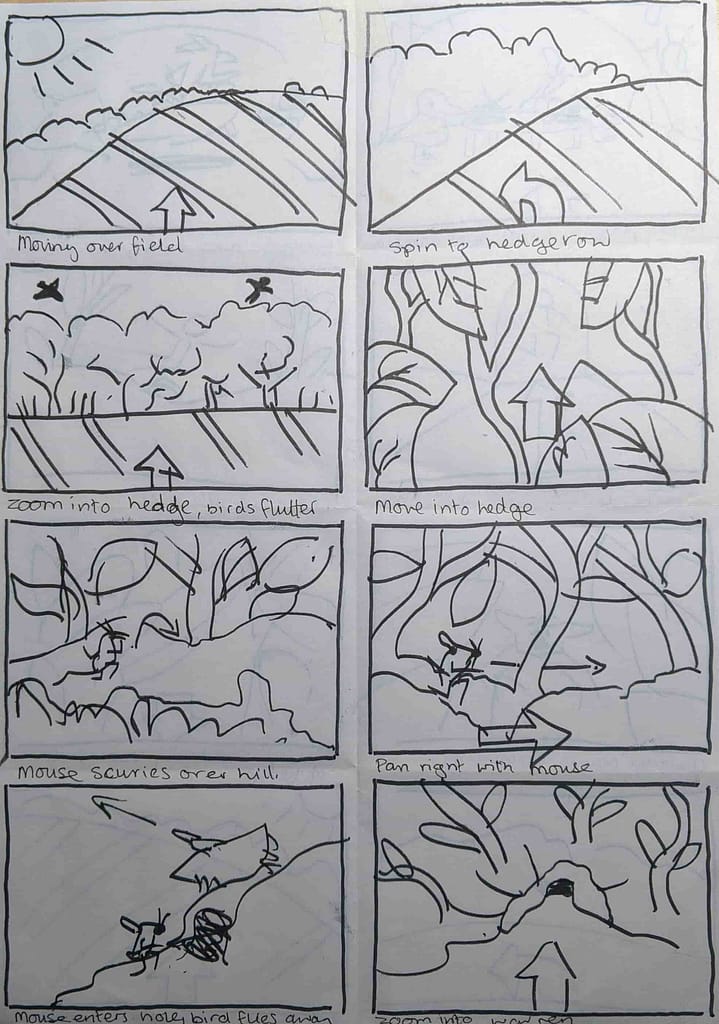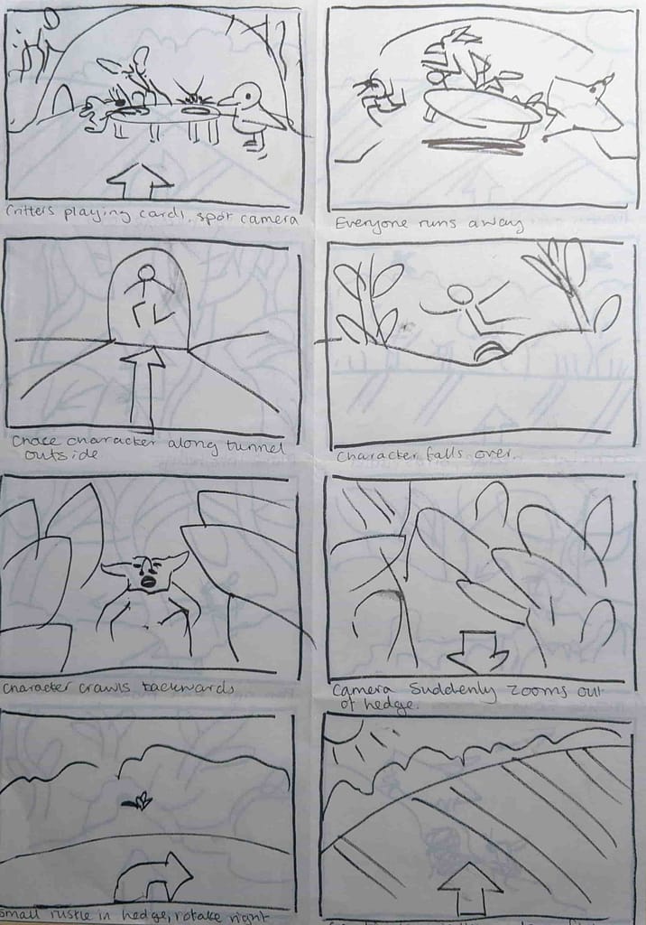 My first storyboards of this idea involved a core set of hedge based characters that would be interrupted by my presence, in the form of me dropping an object into the hedge. I aimed to highlight the creative potential of the hedge by putting it in a different style to just me walking alongside one. I also hoped that the juxtaposition of me just trying to recover this object and my hand going on a fantastical adventure within the hedge could create some funny moments.