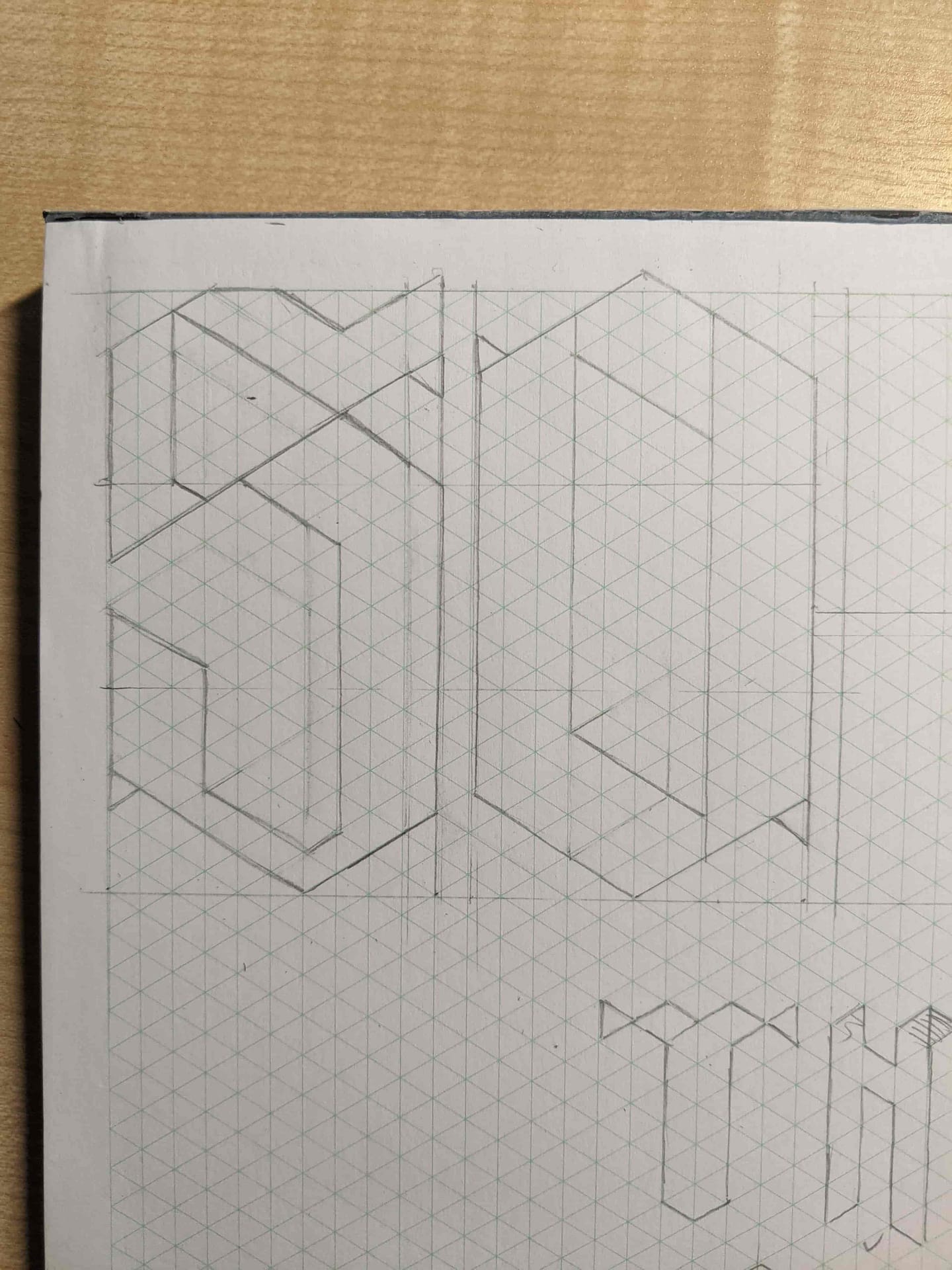 The type needed to reflect elements on the poster and isometric grid. When I was playing around with drafting styles I found they naturally took on a gothic aesthetic when using this grid.
