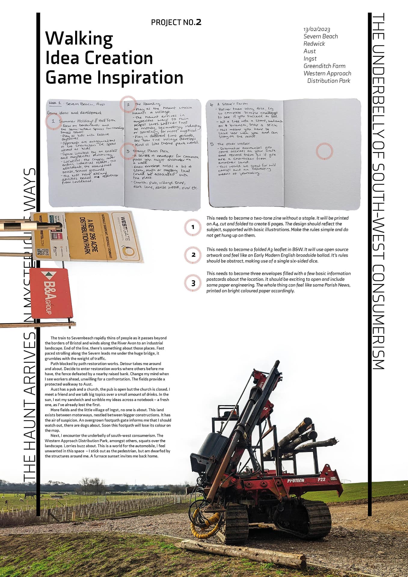 Whilst walking is an effective means of processing thoughts, it can also actively contribute to new ones. The landscape, people and sounds that pass you by all contain fragments of inspiration. I used these fragments to gently begin the process of game planning.